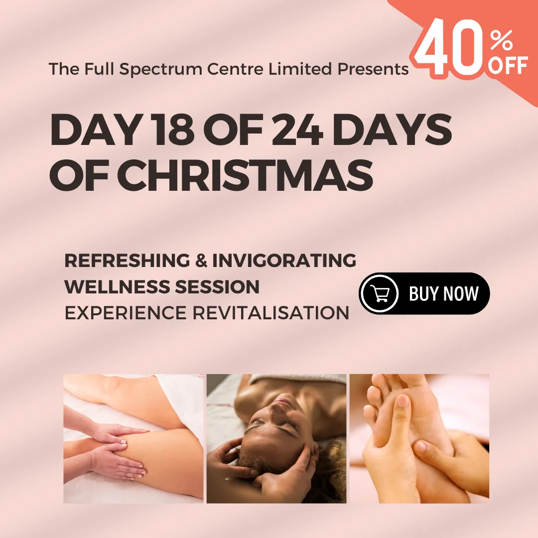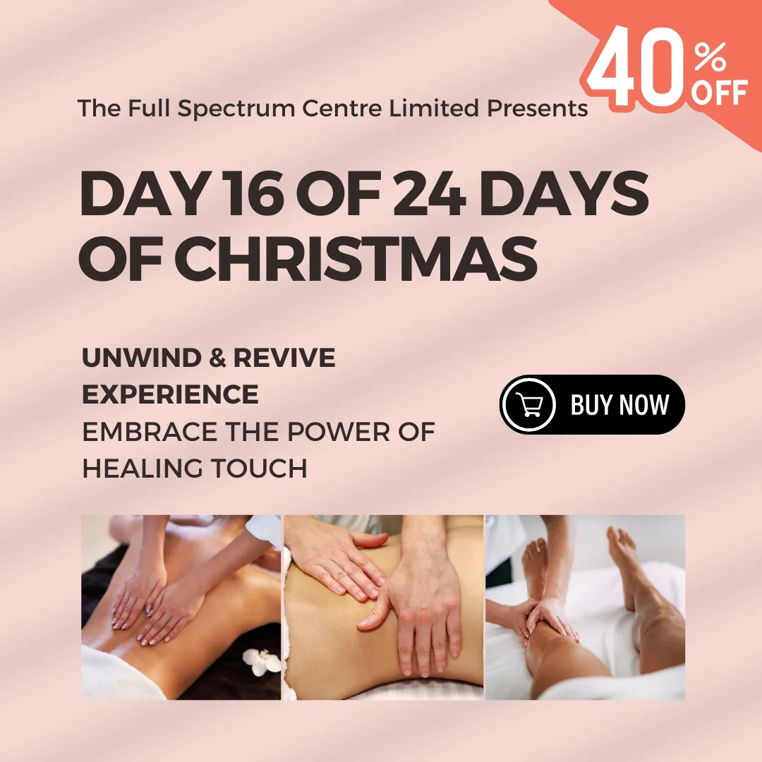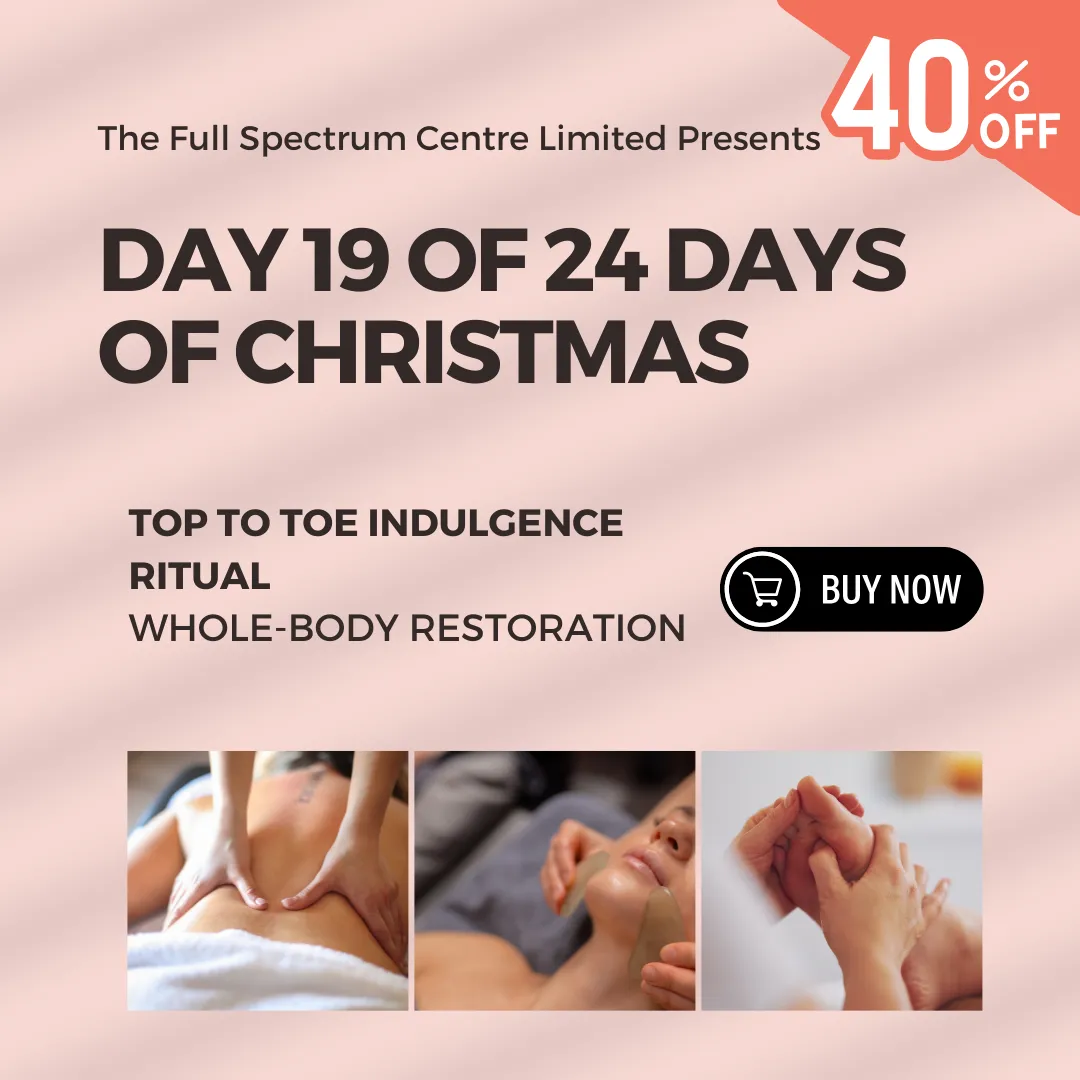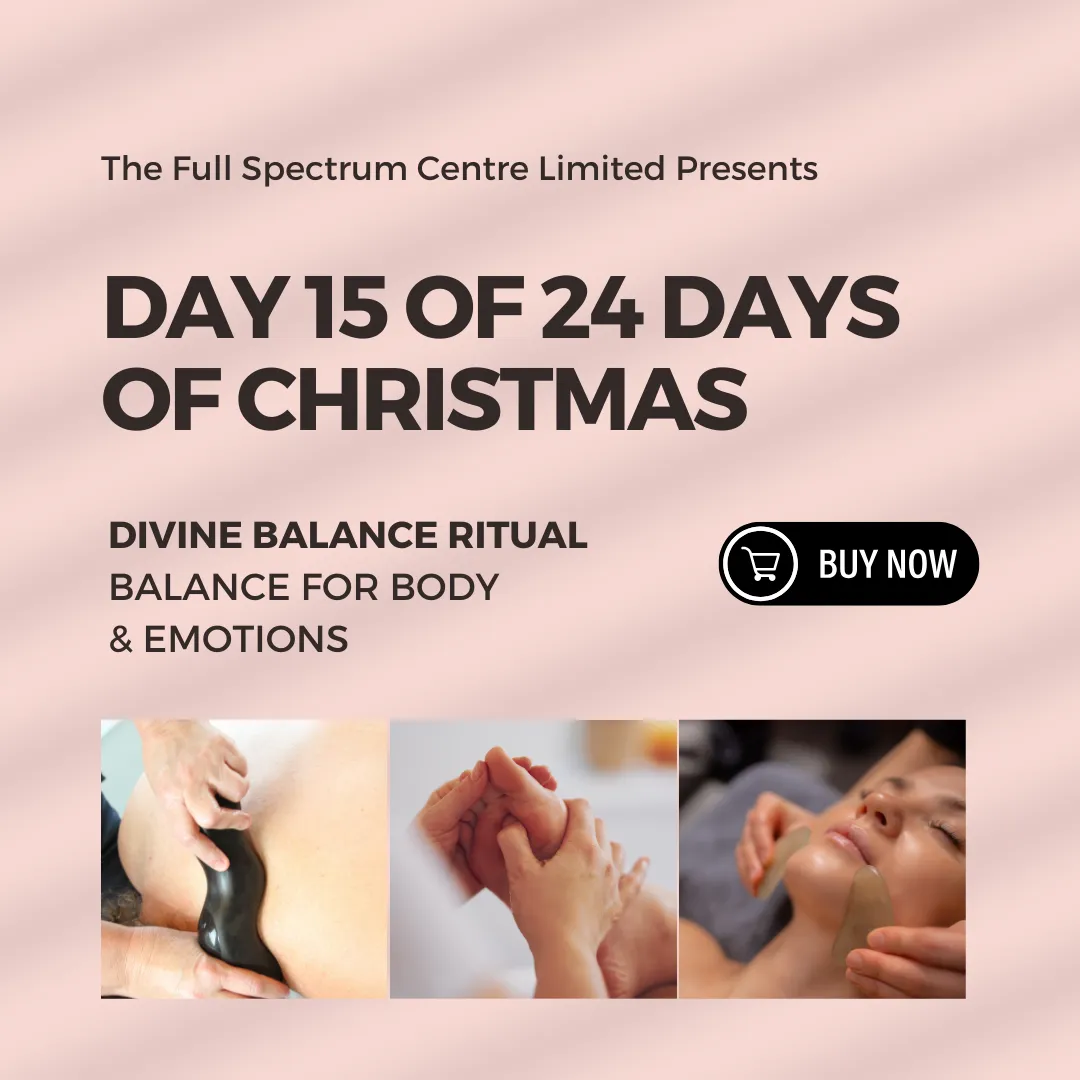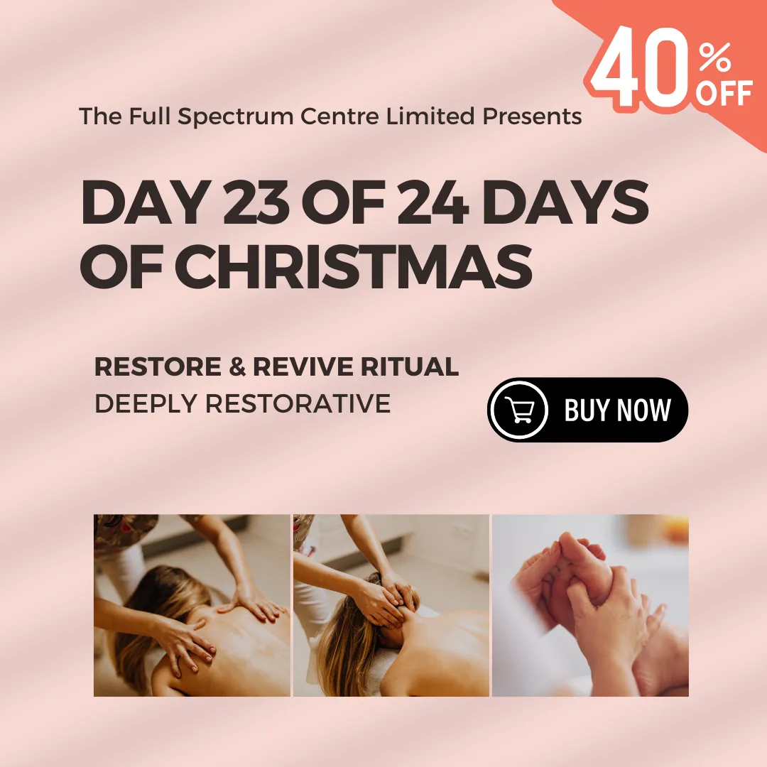 Welcome to The Full Spectrum Centre Limited's most magical event of the year – our '24 Days of Christmas' extravaganza! As the festive season approaches, we invite you to embark on a journey of self-care, rejuvenation, and holistic well-being like no other. Starting on the December 1st and running through to the 24th, our '24 Days of Christmas' event promises daily surprises and enchanting offers, specially crafted to nurture your body, mind, and spirit. Each day, a new and captivating package will be unveiled.