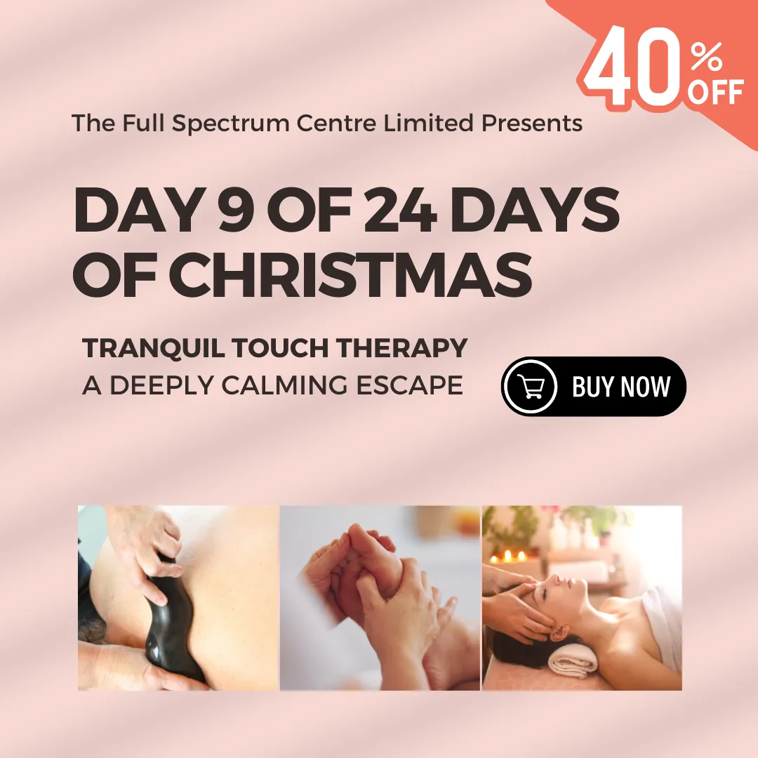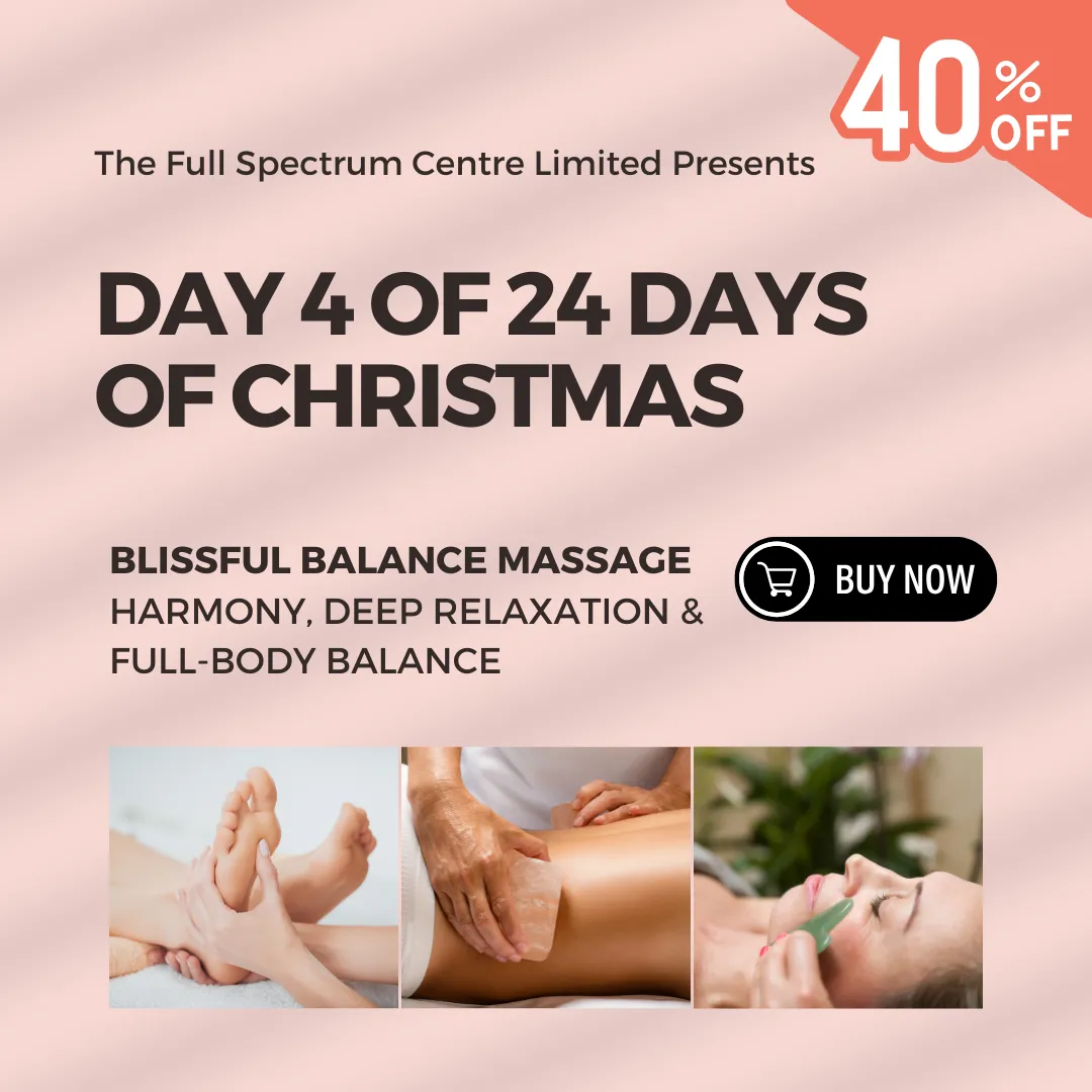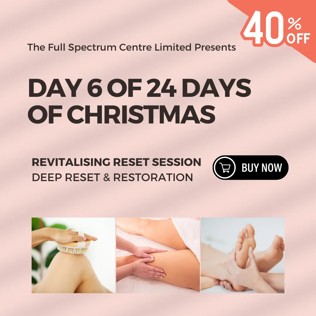 Welcome to The Full Spectrum Centre Limited's most magical event of the year – our '24 Days of Christmas' extravaganza! As the festive season approaches, we invite you to embark on a journey of self-care, rejuvenation, and holistic well-being like no other. Starting on the December 1st and running through to the 24th, our '24 Days of Christmas' event promises daily surprises and enchanting offers, specially crafted to nurture your body, mind, and spirit. Each day, a new and captivating package will be unveiled.