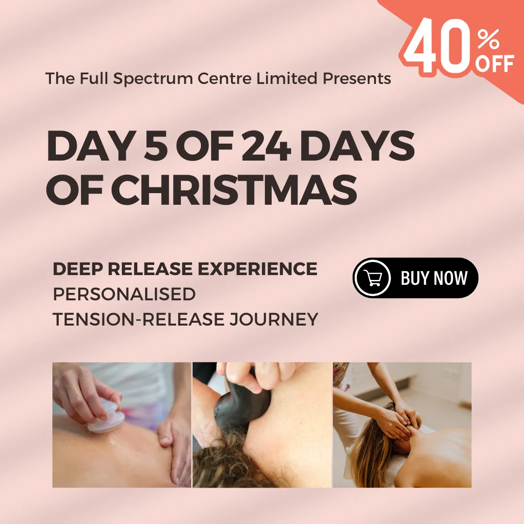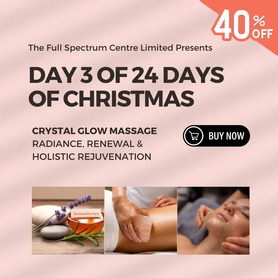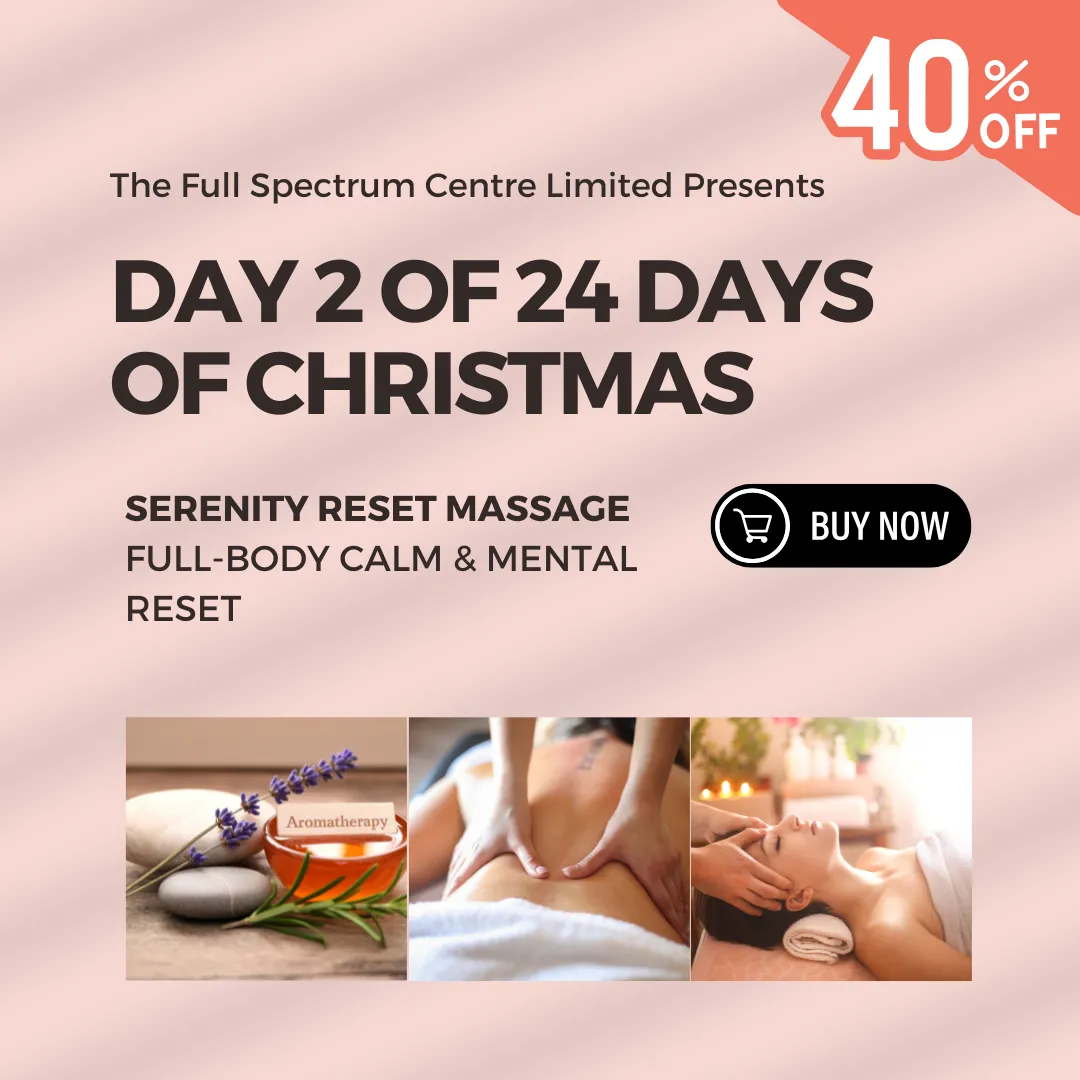 Welcome to The Full Spectrum Centre Limited's most magical event of the year – our '24 Days of Christmas' extravaganza! As the festive season approaches, we invite you to embark on a journey of self-care, rejuvenation, and holistic well-being like no other. Starting on the December 1st and running through to the 24th, our '24 Days of Christmas' event promises daily surprises and enchanting offers, specially crafted to nurture your body, mind, and spirit. Each day, a new and captivating package will be unveiled.